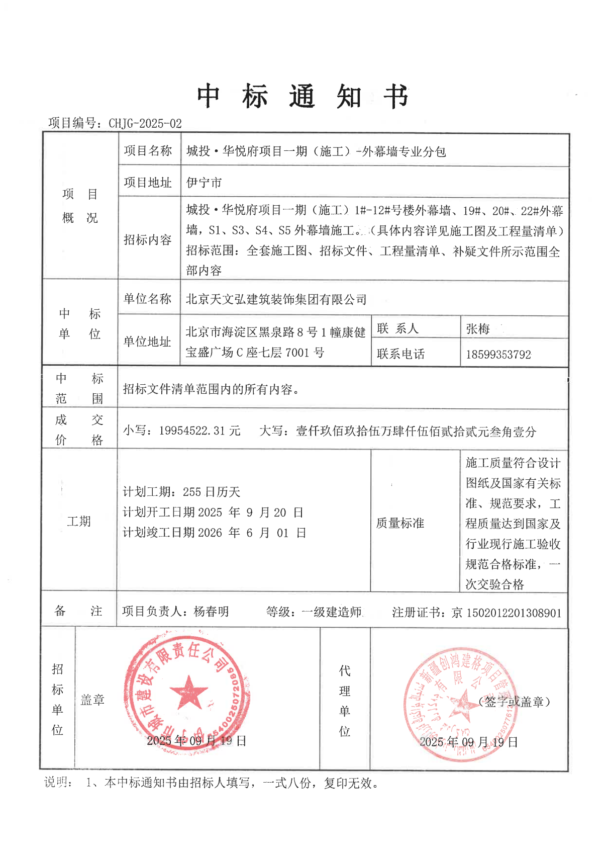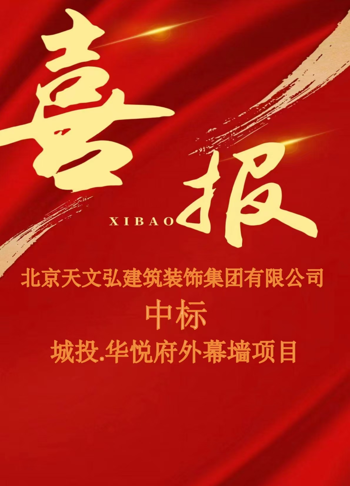 近日,北京天文弘建筑装饰集团有限公司凭借雄厚的技术实力与丰富的行业经验,成功中标 “城投·华悦府项目一期(施工)--外幕墙专业分包”项目(项目编号:CHJG-2025-02),这一成果不仅是对我司专业能力的充分肯定,也为公司在西北地区市场拓展奠定坚实基础。