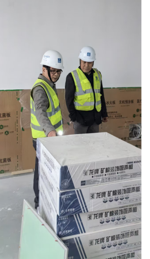 考察过程中,吴绍兵董事长仔细查看了现场使用的“龙牌矿棉装饰吸声板”等建筑材料,逐项核实其防火等级、环保性能等关键指标,并强调要始终坚持质量第一、安全至上的原则,确保每一项工序、每一种材料都符合医疗建筑的特殊要求,将质量、安全、进度的协同管理贯穿始终。
