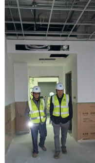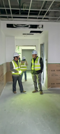 在施工现场,吴绍兵董事长与随行人员仔细察看了墙面施工工艺,对医疗项目特种建材的应用效果进行了细致考察。董事长对现场施工规范,安全措施落实到位给予了高度评价,充分肯定了马总在项目管理上的高标准与严要求。